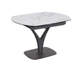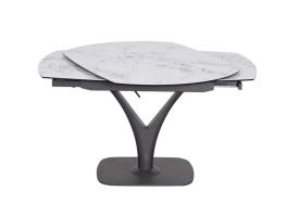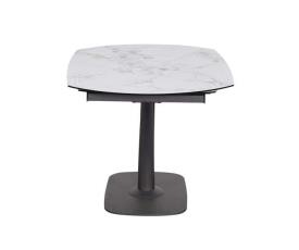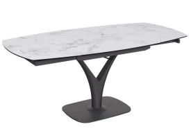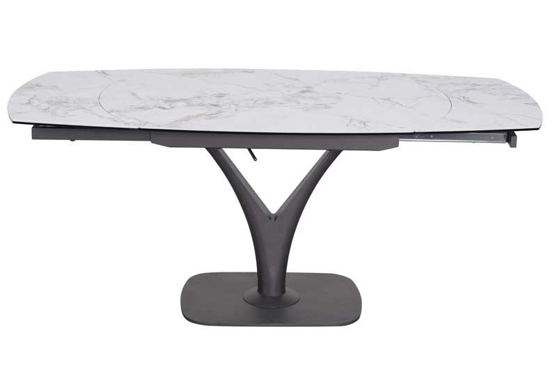 Habillez votre salon avec la table repas Elda 8 personnes. Un design contemporain et épuré, alliant élégance et fonctionnalité. Son piétement central en forme de Y inversé offre une base solide et stable tout en apportant une touche de légèreté à l'ensemble. Piétement et châssis en métal laqué époxy gris, plateau et 2 allonges en verre trempé 8mm recouvert céramique Jade blanche 876 brillante épaisseur 6mm. Ouverture par rotation avec poignée.
